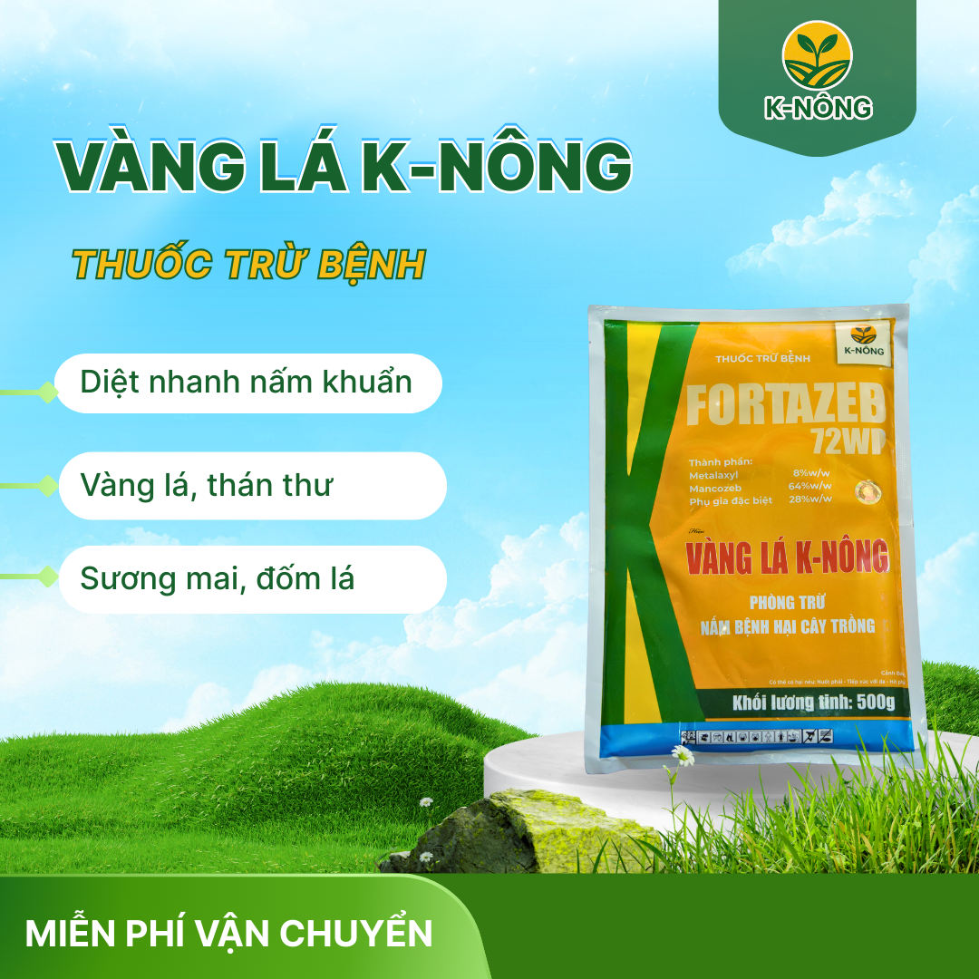 Trước thực trạng đó, K-NÔNG đã nghiên cứu và đưa ra giải pháp chuyên sâu: VÀNG LÁ K-NÔNG (FORTAZEB 72WP) – sản phẩm phòng trừ nấm bệnh phổ rộng, tác động kép nội hấp + tiếp xúc, giúp bảo vệ cây trồng toàn diện từ rễ đến lá, đồng thời hỗ trợ cây phục hồi nhanh, sinh trưởng bền vững.